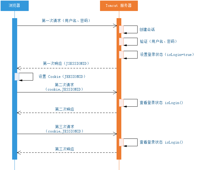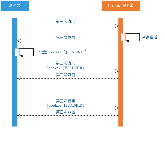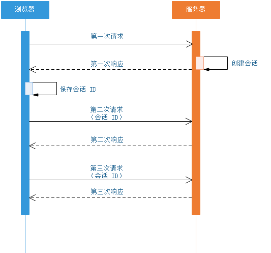 浏览器第一次请求服务器,服务器创建一个会话,并将会话的 id 作为响应的一部分发送给浏览器,浏览器存储会话 id,并在后续第二次和第三次请求中带上会话 id,服务器取得请求中的会话 id 就知道是不是同一个用户了,这个过程用下图说明,后续请求与第一次请求产生了关联